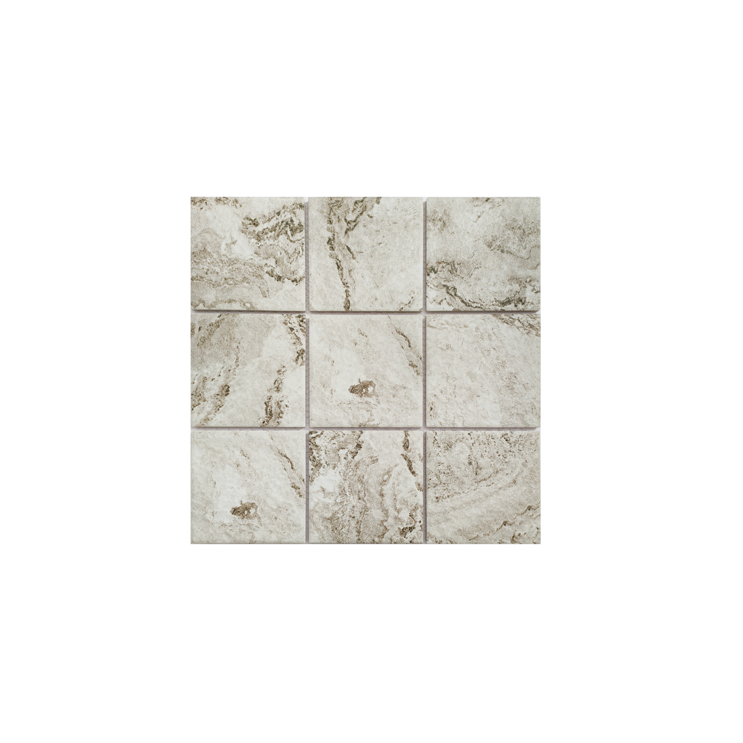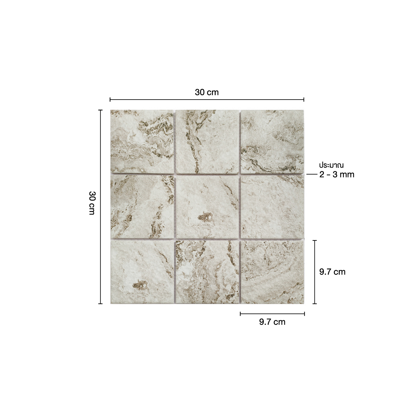 กระเบื้องพอร์ซเลนโมเสค ชนิดเคลือบ (G/NORMAL BODY 0-3%) แบบปูพื้นภายใน แบบปูพื้นภายนอก แบบบุผนังภายใน และแบบบุผนังภายนอก กลุ่มดูดซึมน้ำต่ำน้อยกว่า 3% ขนาด 30x30 เซนติเมตร ผิวสัมผัสแบบ MATT มีให้เลือก 3 เฉดสี ได้แก่ BEIGE, GREY และ DARK GREY