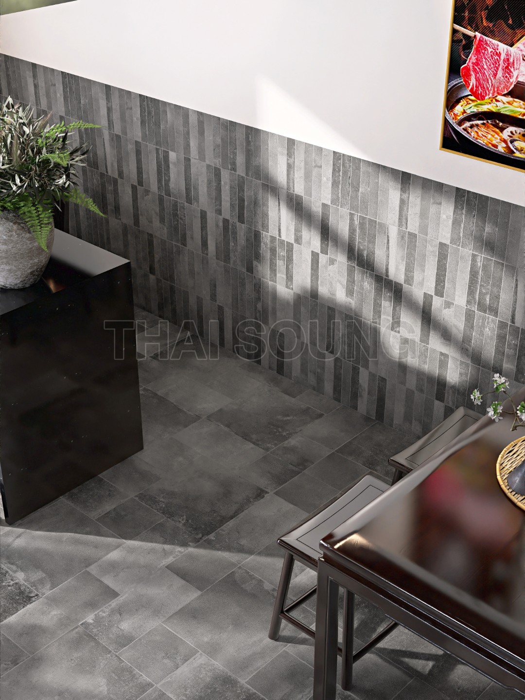 กระเบื้องลายอิฐ ตกแต่ง และกระเบื้องลายโบราณ กระเบื้องสีเทา เหมาะกับการแต่งบ้านให้ดูโมเดิร์น เนื่องจากเป็นเฉดสีที่ทันสมัยและโทนสีกลาง สามารถเข้ากับของตกแต่งบ้าน และ เฟอร์นิเจอร์ได้ กระเบื้องแผ่นใหญ่ขนาด 60*120 เซนติเมตร ลดรอยต่อระหว่างแผ่นกระเบื้อง สร้างความเป็นพื้นที่เดียวกัน เหมาะสำหรับบ้านที่ มีพื้นที่กว้าง เป็นขนาดความกว้างของบันไดมาตราฐานจึงนิยมนำมาเซาะร่องและปูบันได กระเบื้องชนิดพอร์ซเลนมีการผ่านการเผาด้วยความร้อนสูง ผสมผงหินจริง แร่หิน และดินขาว ทำให้ค่าความดูดซึมน้ำต่ำและมีความแข็งแรงจึงสามารถใช้งานได้ทุกสถานที่เป็นกระเบื้องปูพื้นและปูผนัง ทั้งภายนอกและภายในบ้าน กระเบื้องผิวด้าน เหมาะกับการใช้งานดีไซน์โทนโมเดิร์น และการทำความสะอาดกระเบื้อง สามารถทำได้โดยง่าย กระเบื้องกันลื่นปานกลางชนิด R9 เหมาะกับการปูพื้นที่โซนแห้ง หรือ โซนที่ไม่ได้สัมผัสกับน้ำตลอดเวลา เช่น ห้องนอน ห้องนั่งเล่น ห้องครัว หรือ ห้องน้ำโซนแห้ง |