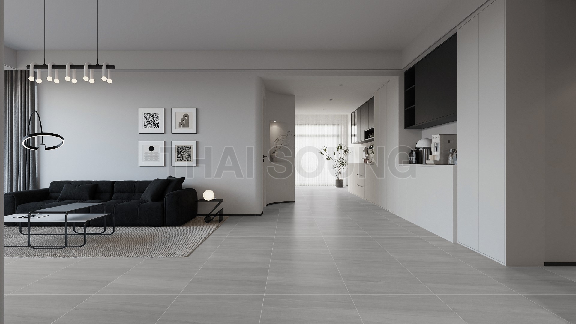 กระเบื้องลายหิน กระเบื้องสีขาว เรียบหรูและดูสบายตา ทำให้พื้นที่ดูกว้างและสว่างมากขึ้น ขนาดมาตราฐาน กระเบื้อง 60*60 เซนติเมตร หรือสามารถนำมาแปรรูปได้เป็น กระเบื้องขนาด 30*30 เซนติเมตร หรือ ขนาด 30*60 กระเบื้องชนิดพอร์ซเลนมีการผ่านการเผาด้วยความร้อนสูง ผสมผงหินจริง แร่หิน และดินขาว ทำให้ค่าความดูดซึมน้ำต่ำและมีความแข็งแรงจึงสามารถใช้งานได้ทุกสถานที่เป็นกระเบื้องปูพื้นและปูผนัง ทั้งภายนอกและภายในบ้าน กระเบื้องผิวกึ่งมันกึ่งด้าน สามารถใช้งานได้ทั้งพื้นทั้งผนัง ไม่สะท้อนแสงจนเกินไป กระเบื้องชนิดนี้ไม่มีค่าต้านทานความลื่น ( Slip Resistance Rating : ค่ากันความลื่น หรือ ค่า R ) จึงเหมาะกับการปูพื้นที่โซนแห้ง เช่น ห้องนอน ห้องนั่งเล่น หรือ ห้องครัว |