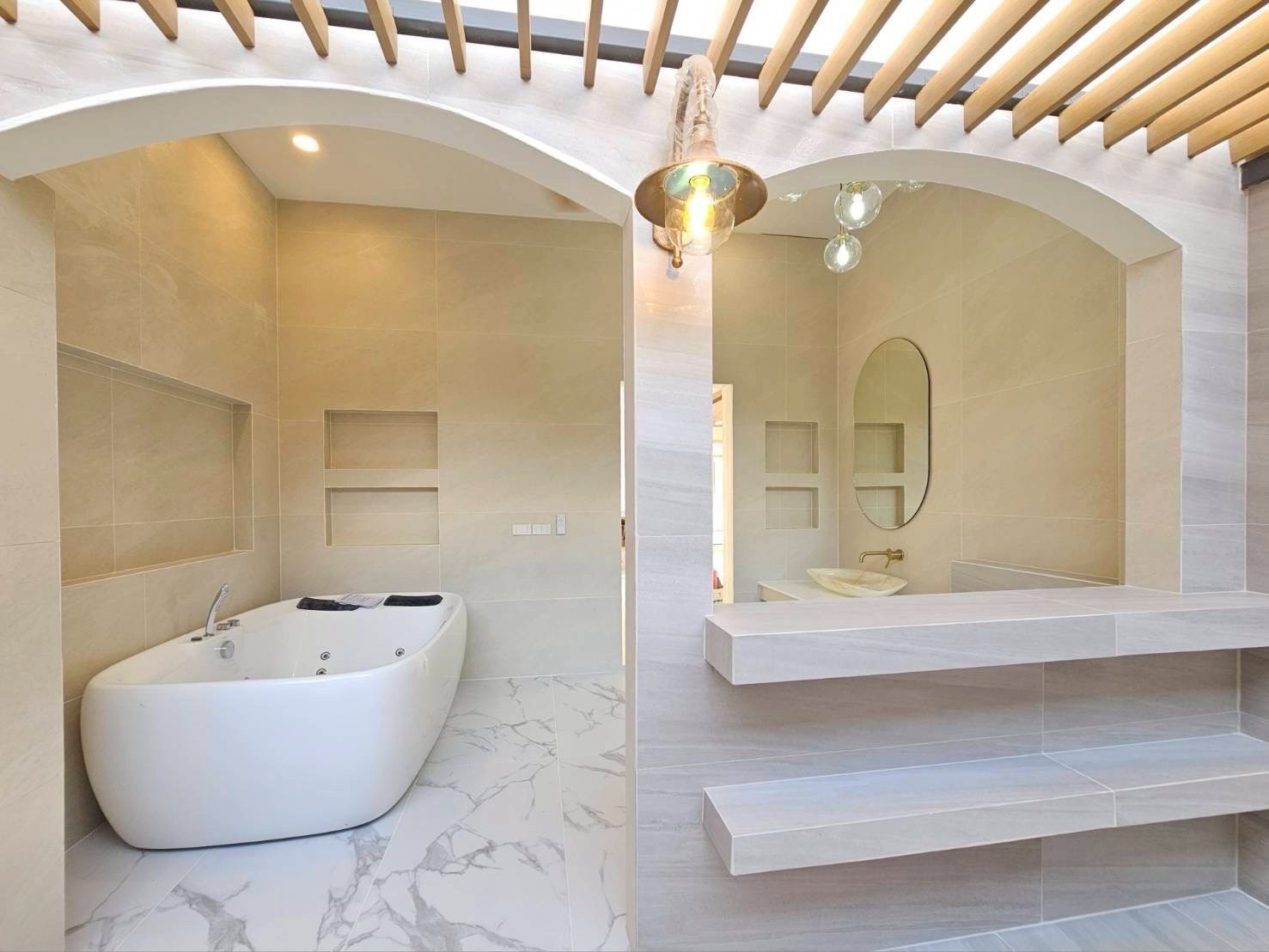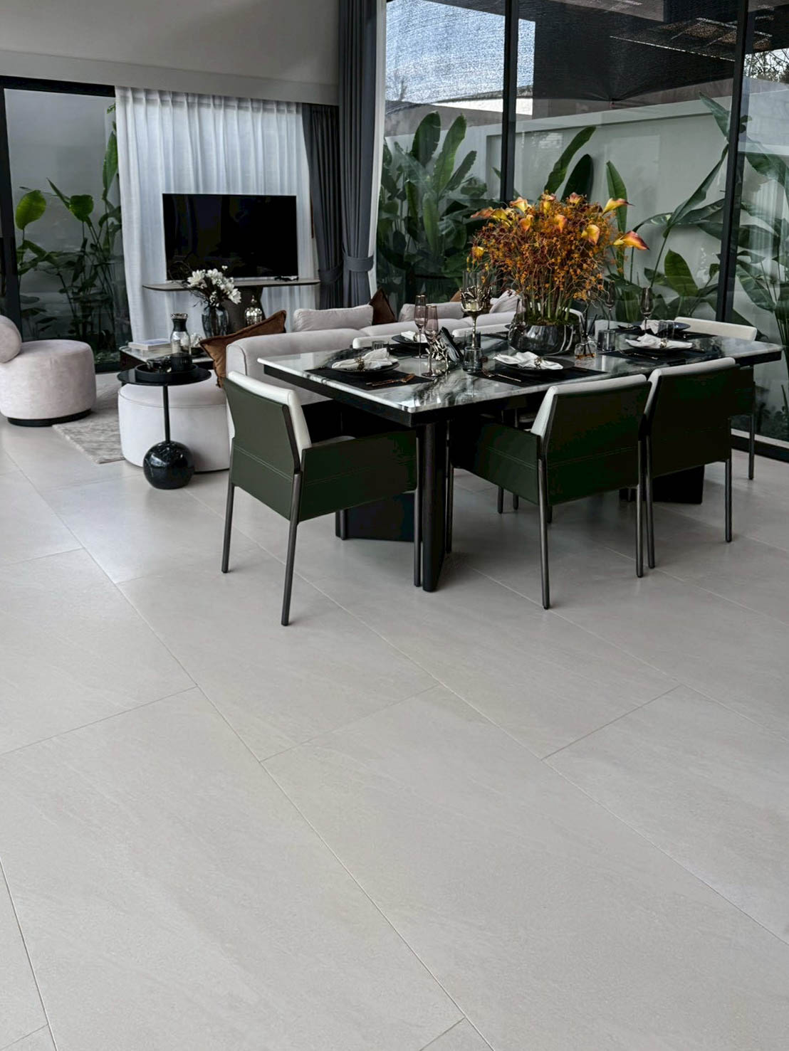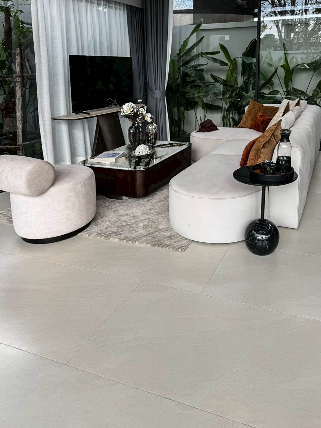 กระเบื้องลายหิน กระเบื้องสีขาว เรียบหรูและดูสบายตา ทำให้พื้นที่ดูกว้างและสว่างมากขึ้น กระเบื้องแผ่นใหญ่ขนาด 60*120 เซนติเมตร ลดรอยต่อระหว่างแผ่นกระเบื้อง สร้างความเป็นพื้นที่เดียวกัน เหมาะสำหรับบ้านที่ มีพื้นที่กว้าง เป็นขนาดความกว้างของบันไดมาตราฐานจึงนิยมนำมาเซาะร่องและปูบันได กระเบื้องชนิดพอร์ซเลนมีการผ่านการเผาด้วยความร้อนสูง ผสมผงหินจริง แร่หิน และดินขาว ทำให้ค่าความดูดซึมน้ำต่ำและมีความแข็งแรงจึงสามารถใช้งานได้ทุกสถานที่เป็นกระเบื้องปูพื้นและปูผนัง ทั้งภายนอกและภายในบ้าน กระเบื้องผิวด้าน เหมาะกับการใช้งานดีไซน์โทนโมเดิร์น และการทำความสะอาดกระเบื้อง สามารถทำได้โดยง่าย กระเบื้องกันลื่นปานกลางชนิด R9 เหมาะกับการปูพื้นที่โซนแห้ง หรือ โซนที่ไม่ได้สัมผัสกับน้ำตลอดเวลา เช่น ห้องนอน ห้องนั่งเล่น ห้องครัว หรือ ห้องน้ำโซนแห้ง |