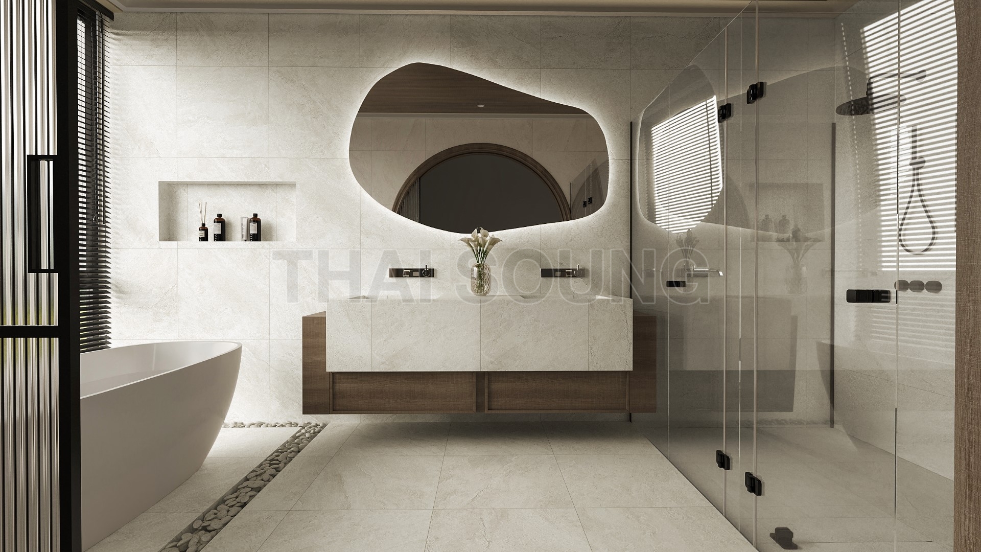 กระเบื้องลายหิน กระเบื้องสีครีมและสีเบจ เป็นโทนสีที่ได้รับความนิยมเพื่อสร้างบรรยากาศอบอุ่นให้พื้นที่ เป็นโทนสีเรียบง่าย ขนาดมาตราฐาน กระเบื้อง 60*60 เซนติเมตร หรือสามารถนำมาแปรรูปได้เป็น กระเบื้องขนาด 30*30 เซนติเมตร หรือ ขนาด 30*60 กระเบื้องชนิดพอร์ซเลนมีการผ่านการเผาด้วยความร้อนสูง ผสมผงหินจริง แร่หิน และดินขาว ทำให้ค่าความดูดซึมน้ำต่ำและมีความแข็งแรงจึงสามารถใช้งานได้ทุกสถานที่เป็นกระเบื้องปูพื้นและปูผนัง ทั้งภายนอกและภายในบ้าน กระเบื้องผิวด้าน เหมาะกับการใช้งานดีไซน์โทนโมเดิร์น และการทำความสะอาดกระเบื้อง สามารถทำได้โดยง่าย กระเบื้องกันลื่นสูง R10 เหมาะกับการปูพื้นที่ทั้งโซนแห้ง หรือ โซนที่เปียก เช่น ห้องนอน ห้องนั่งเล่น ห้องครัว ห้องน้ำ สวนหน้าบ้าน |