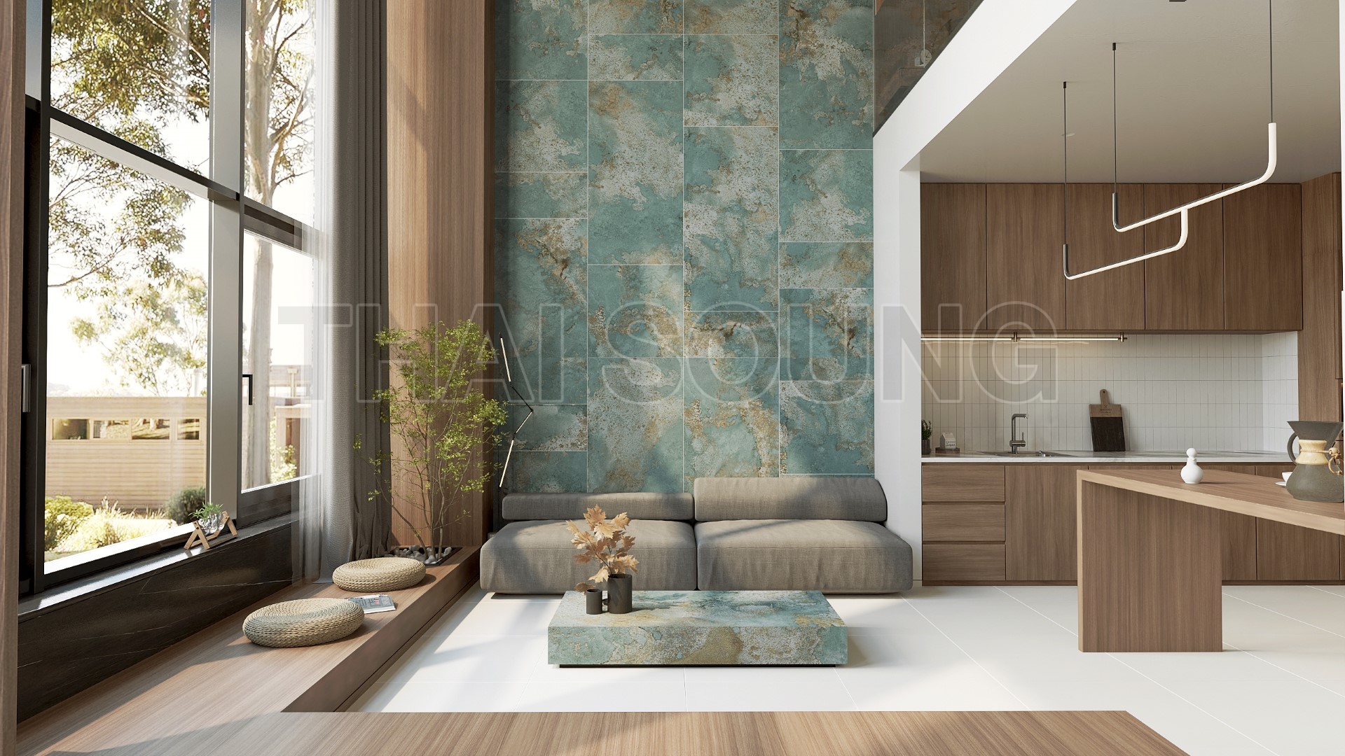 GX TIFFANY กระเบื้องเอกสิทธิ์ลวดลายเฉพาะ ไทย สุงฯ ที่เดียวในประเทศไทย กระเบื้องพอร์ซเลน GX TIFFANY SERIES ชนิดเคลือบ (G/COLOR BODY 0-3%) แบบปูพื้น บุผนัง ภายในและภายนอก กลุ่มดูดซึมน้ำต่ำน้อยกว่า 3% กระเบื้องลวดลายหินธรรมชาติ มีเฉพาะขนาด 90x180 เซนติเมตร ผิวสัมผัส MATT ค่า R9 ต้านทานการลื่น ลวดลาย RANDOM 6 ลาย ทำให้ดูแตกต่างแต่สวยงามและลงตัว กระเบื้องโทนสีฟ้าสบายตา ให้ความรู้สึกผ่อนคลาย เรียบง่าย ดูดี เหมาะทุกการตกแต่ง เข้าได้กับห้องทุกสไตล์