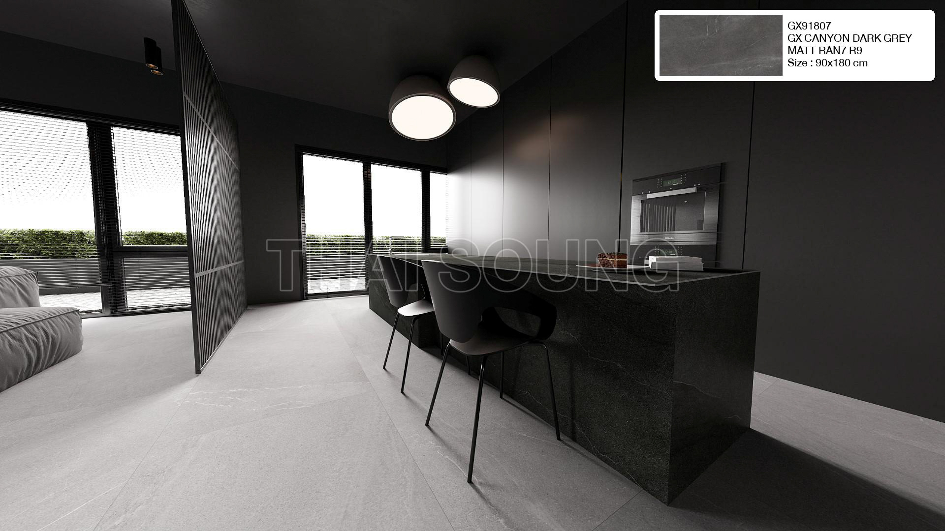 กระเบื้องพอร์ซเลน GX CANYON SERIES ชนิดเคลือบ (G/NORMAL BODY) แบบปูพื้น บุผนัง ภายในและภายนอก กลุ่มดูดซึมน้ำต่ำน้อยกว่า 3% กระเบื้องลวดลายหินธรรมชาติ มีเฉพาะขนาด 90x180 เซนติเมตร ผิวสัมผัส MATT ค่า R9 ต้านทานการลื่น ลวดลาย RANDOM 7 ลาย ทำให้ดูแตกต่างแต่สวยงามและลงตัว กระเบื้องโทนสีเทา มีให้เลือก 3 เฉดสี ได้แก่ LIGHT GREY, GREY และ DARK GREY เรียบง่าย ดูดี เหมาะทุกการตกแต่ง เข้าได้กับห้องทุกสไตล์