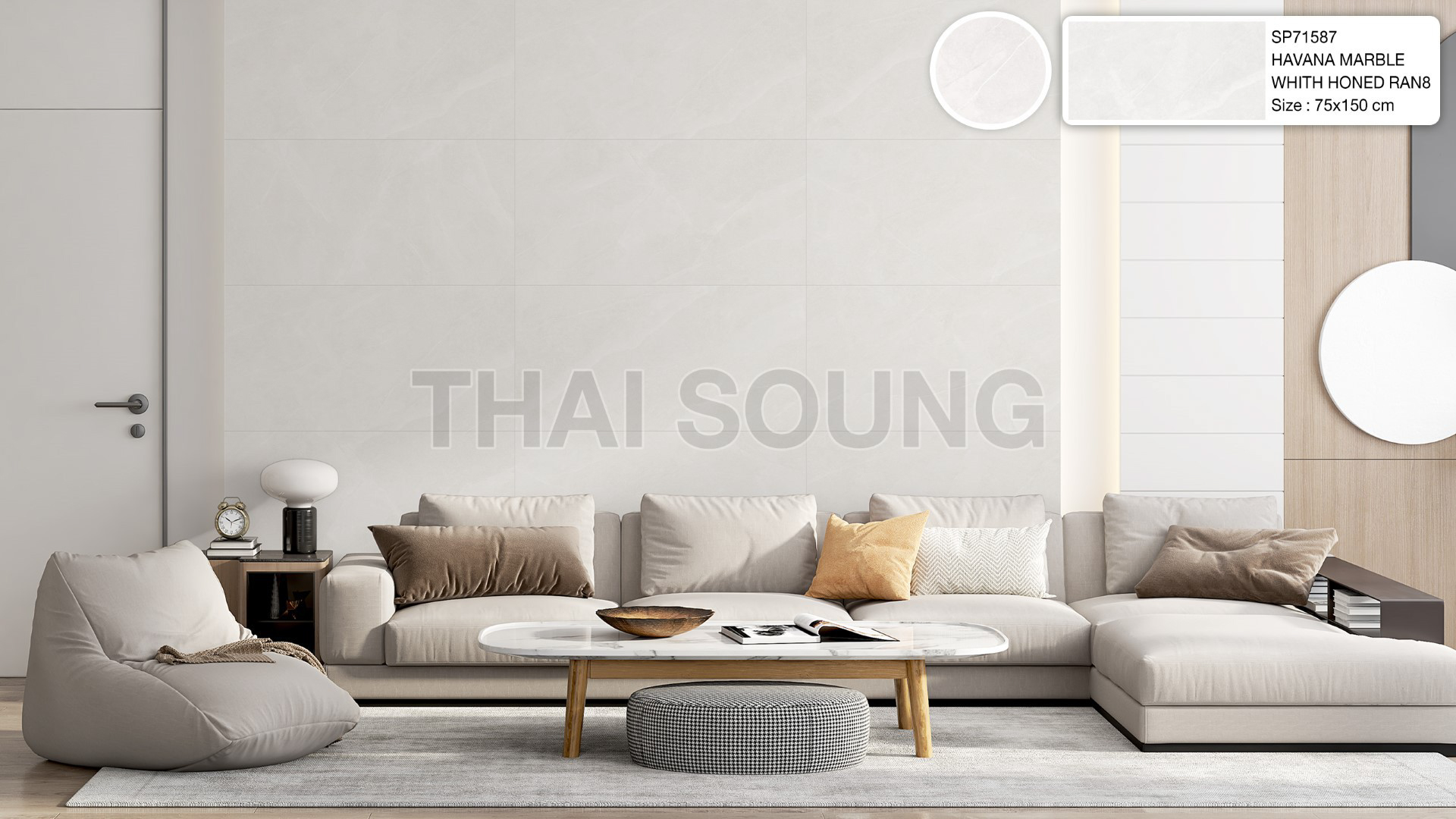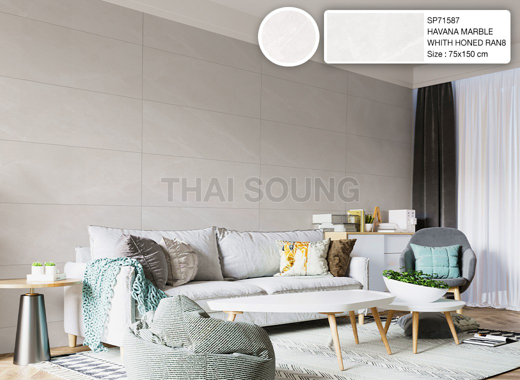 กระเบื้องพอร์ซเลน HAVANA MARBLE SERIES ชนิดเคลือบ (G/NORMAL BODY 0.5-3%) แบบปูพื้น บุผนัง ภายในและภายนอก กลุ่มดูดซึมน้ำน้อยกว่า 3% ดีไซน์เลียนแบบหินอ่อนมีขนาด 75X150 เซนติเมตร ผิวสัมผัส HONED ลวดลาย RANDOM 8 ลาย มีเฉดสีให้เลือก 3 เฉดสี ได้แก่ WHITE AND GREY COLOR จึงได้รับความนิยมเลือกใช้งานออกแบบตกแต่งภายในโรงแรม อาคารสำนักงานต่างๆ งานบ้านพักส่วนบุคคล ที่ต้องการเน้นความเป็นเอกลักษณ์ หรูหรา |