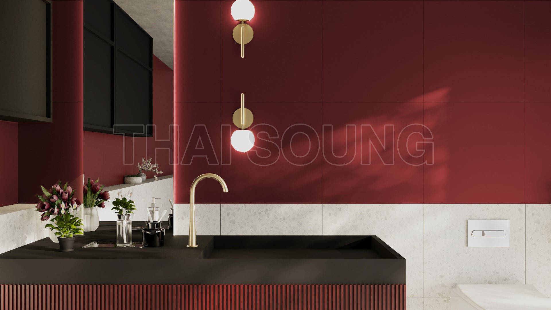 กระเบื้องสีพื้น โทนสีแดงเบอร์กันดี สามารถนำมาตกแต่งห้องให้ดูโมเดิร์นและโดดเด่น สะดุดตา เป็นเอกลักษณ์ได้ ให้เลือกใช้สีแดงเป็นส่วนประกอบเพียงบางส่วน เพียงบางมุม และนำสีโทนเย็นมาใช้ร่วมด้วย อาทิเช่น สีขาว สีเทา เป็นการตัดความร้อนของสีแดงไม่ให้มีมากเกินไป