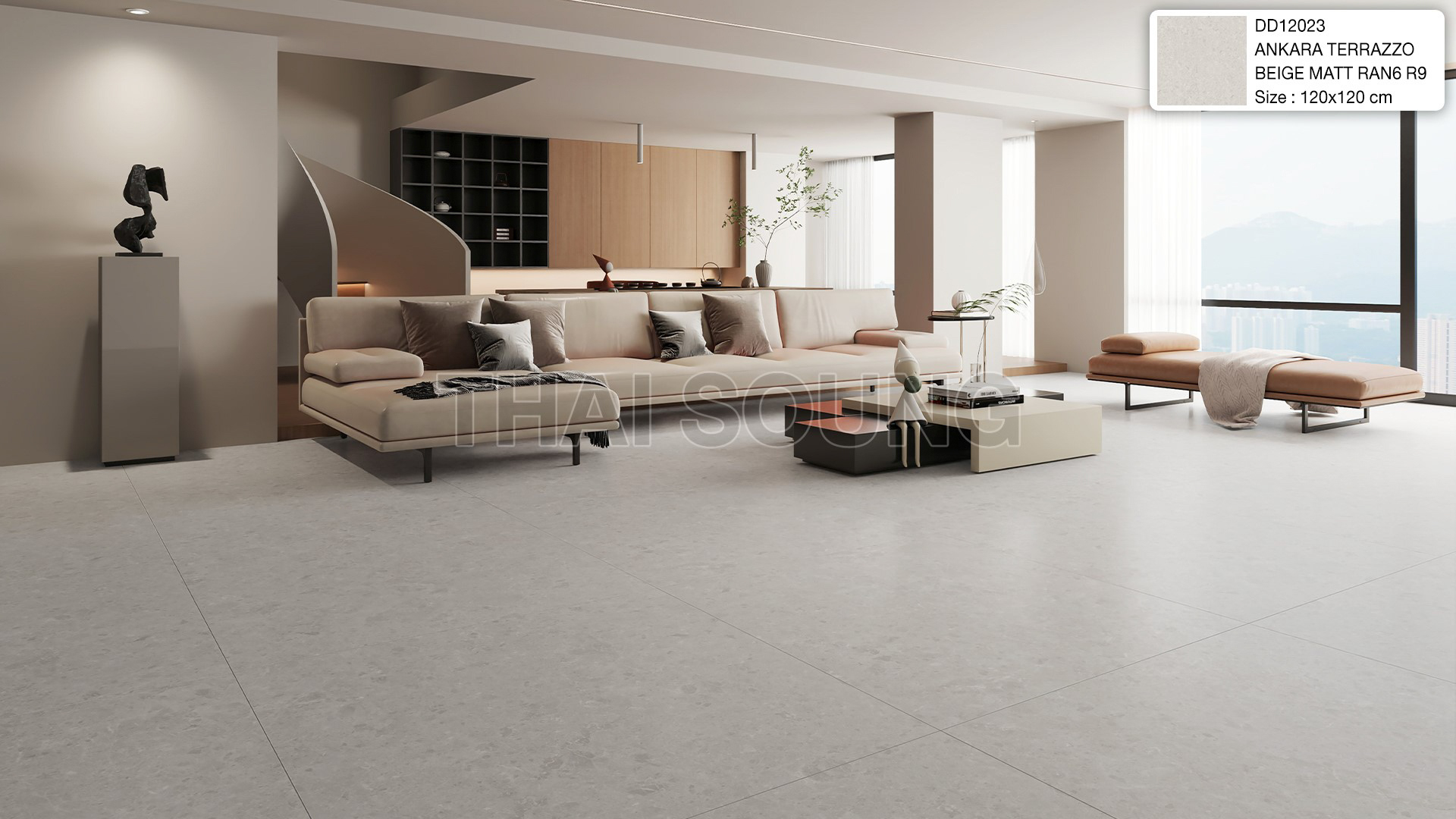 กระเบื้ื้องลายหินขัด หรือ กระเบื้องลายหินล้าง กระเบื้องสีครีมและสีเบจ เป็นโทนสีที่ได้รับความนิยมเพื่อสร้างบรรยากาศอบอุ่นให้พื้นที่ เป็นโทนสีเรียบง่าย กระเบื้องแผ่นใหญ่ขนาด 120*120 เซนติเมตร ลดรอยต่อระหว่างแผ่นกระเบื้อง สร้างความเป็นพื้นที่เดียวกัน เหมาะสำหรับบ้านที่ มีพื้นที่กว้าง หรือสามารถนำไปตกแต่งเป็นผนัง feature wall ได้ กระเบื้องชนิดพอร์ซเลนมีการผ่านการเผาด้วยความร้อนสูง ผสมผงหินจริง แร่หิน และดินขาว ทำให้ค่าความดูดซึมน้ำต่ำและมีความแข็งแรงจึงสามารถใช้งานได้ทุกสถานที่เป็นกระเบื้องปูพื้นและปูผนัง ทั้งภายนอกและภายในบ้าน กระเบื้องกันลื่นปานกลางชนิด R9 เหมาะกับการปูพื้นที่โซนแห้ง หรือ โซนที่ไม่ได้สัมผัสกับน้ำตลอดเวลา เช่น ห้องนอน ห้องนั่งเล่น ห้องครัว หรือ ห้องน้ำโซนแห้ง |