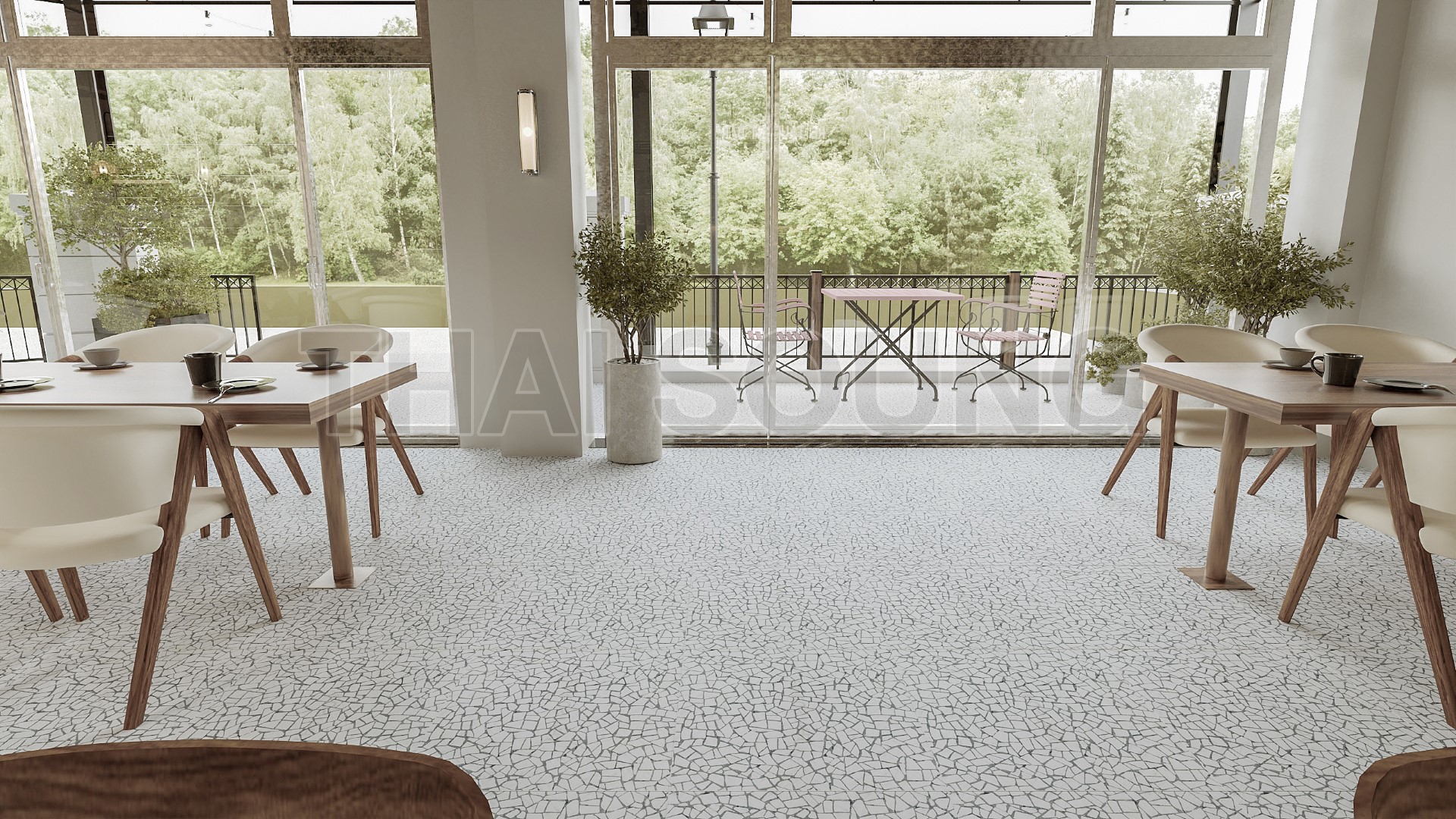 กระเบื้องเลียนแบบหินขัด นับเป็นจุดตั้งต้นของแรงบันดาลใจในการออกแบบงานดีไซน์ หินขัดลงบนกระเบื้องลวดลายเม็ดหินสีขาวขนาดใหญ่ ที่เรียงตัวกันอยู่อย่างเป็นระเบียบ เพิ่มความเรียบหรูให้พื้นดูมีระดับและกว้างขึ้น สามารถออกแบบห้อง, อาคาร, บ้านพักอาศัย หรือนำไปใช้งานร่วมกับวัสดุอื่นๆ เพื่อเพิ่มระดับของงานออกแบบในสไตล์ต่างๆได้อย่างหลากหลายและลงตัว