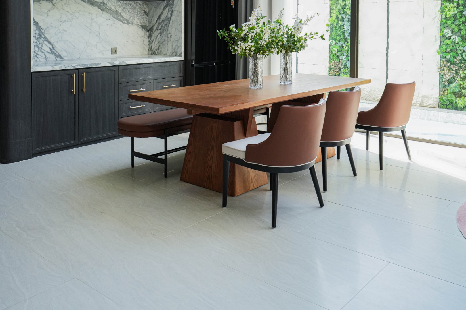 กระเบื้องลายหินลาวา หรือ ทราเวอร์ทีน กระเบื้องสีเทา เหมาะกับการแต่งบ้านให้ดูโมเดิร์น เนื่องจากเป็นเฉดสีที่ทันสมัยและโทนสีกลาง สามารถเข้ากับของตกแต่งบ้าน และ เฟอร์นิเจอร์ได้ กระเบื้องแผ่นใหญ่ขนาด 60*120 เซนติเมตร ลดรอยต่อระหว่างแผ่นกระเบื้อง สร้างความเป็นพื้นที่เดียวกัน เหมาะสำหรับบ้านที่ มีพื้นที่กว้าง เป็นขนาดความกว้างของบันไดมาตราฐานจึงนิยมนำมาเซาะร่องและปูบันได กระเบื้องชนิดพอร์ซเลนมีการผ่านการเผาด้วยความร้อนสูง ผสมผงหินจริง แร่หิน และดินขาว ทำให้ค่าความดูดซึมน้ำต่ำและมีความแข็งแรงจึงสามารถใช้งานได้ทุกสถานที่เป็นกระเบื้องปูพื้นและปูผนัง ทั้งภายนอกและภายในบ้าน กระเบื้องผิวฮอน หรือรู้จักอีกอีกอย่างว่ากระเบื้องผิวซาติน ให้ความรู้สึกนุ่มนวล สบายเท้าเวลาเดิน กระเบื้องชนิดนี้ไม่มีค่าต้านทานความลื่น ( Slip Resistance Rating : ค่ากันความลื่น หรือ ค่า R ) จึงเหมาะกับการปูพื้นที่โซนแห้ง เช่น ห้องนอน ห้องนั่งเล่น หรือ ห้องครัว |