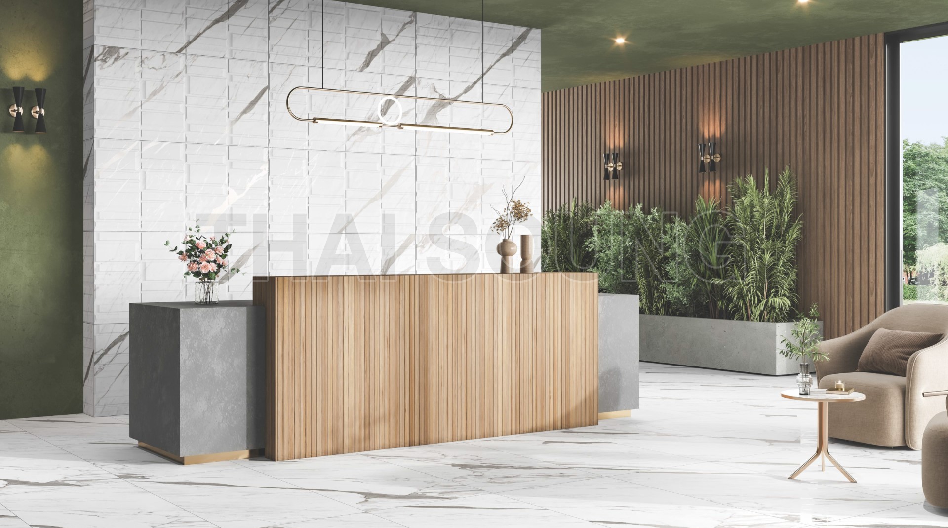 ซีรีย์ WHITE CARARA/CALACATTA (CAL) กระเบื้องพอร์ซเลน WHITE CARARA/CALACATTA (CAL) SERIES ชนิดเคลือบ (G/NORMAL BODY 0-3%) แบบปูพื้น บุผนัง ภายในและภายนอก กลุ่มดูดซึมน้ำต่ำน้อยกว่า 3% ลายหินอ่อนสีดำและขาวธรรมชาติ ด้วยลวดลาย RANDOM 6 ลาย ที่มีความความโดดเด่น ดึงความหรูหราและสวยงามฉพาะตัวสู่สายตาผู้พบเห็น มีเฉพาะขนาด 60x120 เซนติเมตร ผิวสัมผัส MATT R9 มีให้เลือก 2 สี ได้แก่ CLASSIC WHITE และ GREY จึงได้รับความนิยมเลือกใช้งานออกแบบตกแต่งภายในโรงแรม อาคารสำนักงานต่างๆ งานบ้านพักส่วนบุคคล ที่ต้องการเน้นความเป็นเอกลักษณ์ หรูหรา |