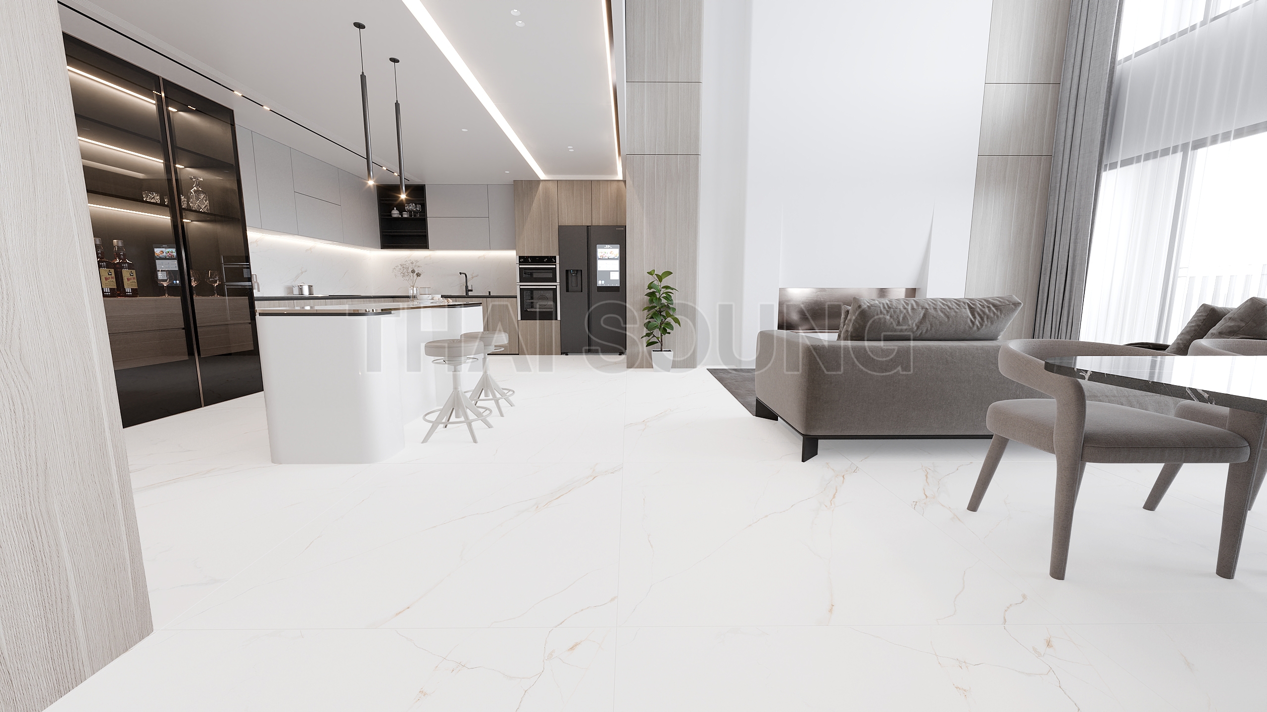 กระเบื้องลายหินอ่อน กระเบื้องสีขาว เรียบหรูและดูสบายตา ทำให้พื้นที่ดูกว้างและสว่างมากขึ้น กระเบื้องแผ่นใหญ่ขนาด 120*120 เซนติเมตร ลดรอยต่อระหว่างแผ่นกระเบื้อง สร้างความเป็นพื้นที่เดียวกัน เหมาะสำหรับบ้านที่ มีพื้นที่กว้าง หรือสามารถนำไปตกแต่งเป็นผนัง feature wall ได้ กระเบื้องชนิดพอร์ซเลนมีการผ่านการเผาด้วยความร้อนสูง ผสมผงหินจริง แร่หิน และดินขาว ทำให้ค่าความดูดซึมน้ำต่ำและมีความแข็งแรงจึงสามารถใช้งานได้ทุกสถานที่เป็นกระเบื้องปูพื้นและปูผนัง ทั้งภายนอกและภายในบ้าน กระเบื้องผิวด้าน เหมาะกับการใช้งานดีไซน์โทนโมเดิร์น และการทำความสะอาดกระเบื้อง สามารถทำได้โดยง่าย กระเบื้องกันลื่นปานกลางชนิด R9 เหมาะกับการปูพื้นที่โซนแห้ง หรือ โซนที่ไม่ได้สัมผัสกับน้ำตลอดเวลา เช่น ห้องนอน ห้องนั่งเล่น ห้องครัว หรือ ห้องน้ำโซนแห้ง |