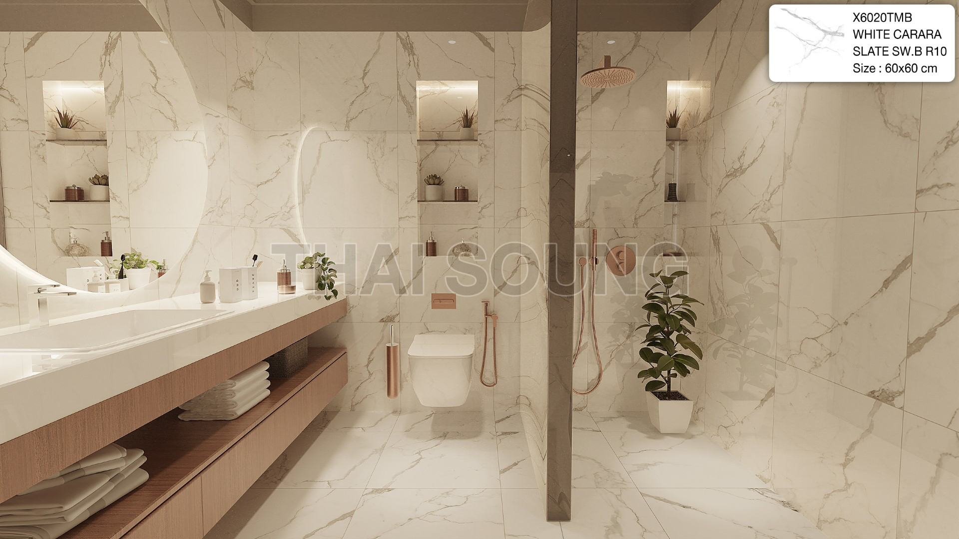 กระเบื้องพอร์ซเลน WHITE CARARA / CALACATTA (X6020) SERIES ชนิดเคลือบ (G/SUPER WHITE BODY 0-3%) แบบปูพื้น บุผนัง ภายในและภายนอก กลุ่มดูดซึมน้ำต่ำน้อยกว่า 3% มีเฉพาะขนาด 60x60 เซนติเมตร ผิวสัมผัสแบบ MATT ค่า R10 ต้านทานการลื่น ลวดลาย RANDOM ไม่จำกัดลาย สามารถเลือกสรรให้เหมาะกับงานออกแบบได้อย่างหลากหลาย