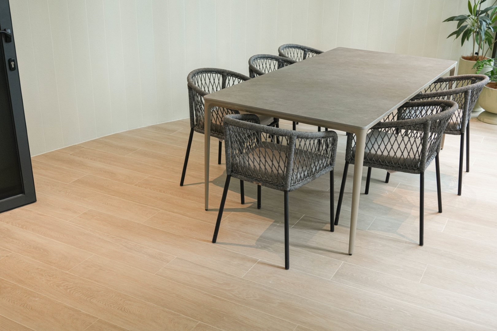 ด้วยกระเบื้องที่เลียนแบบลายไม้ เมื่อติดตั้งแล้วจะรู้สึกถึงความอ่อนไหวของลวดลายไม้ได้เป็นอย่างดี คุณสมบัติ เป็นวัสดุที่สามารถทดแทนไม้จริง อีกทั้งยังดูแลรักษาง่ายและเพิ่มอายุการใช้งานได้มากกว่าวัสดุจากธรรมชาติ