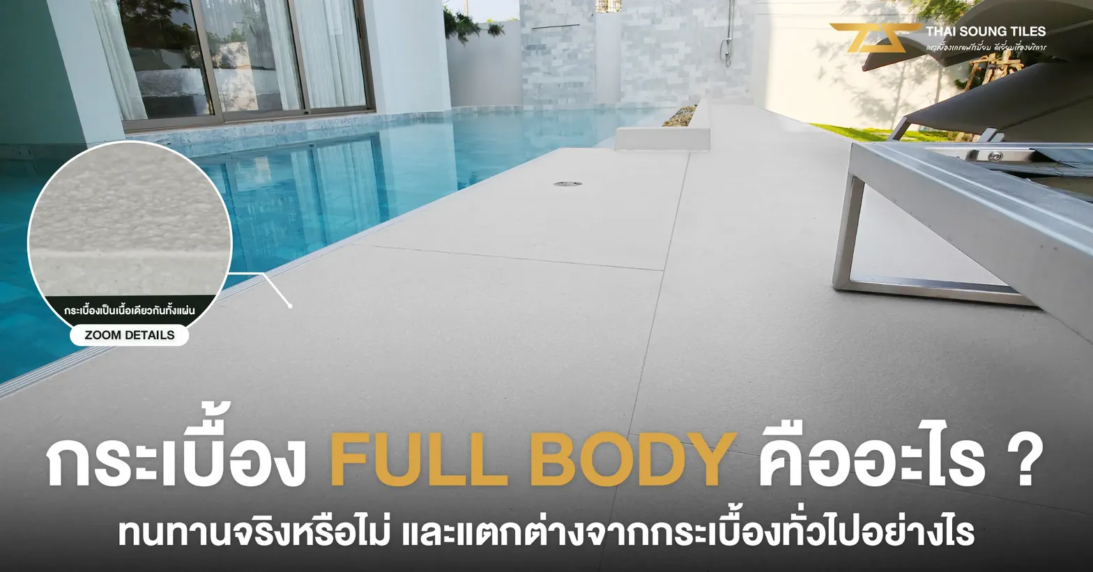 กระเบื้อง Full Body คือกระเบื้องมีลักษณะพิเศษคือเป็นเนื้อเดียวกันทั้งแผ่น และมีความแข็งแรงและทนทานเป็นพิเศษ ผลิตจากวัสดุคุณภาพสูงและเทคโนโลยีที่ทันสมัย ทำให้มีความหนาแน่นสูง มีจุดเด่นคือ สามารถทนทานต่อแรงกระแทกสูง และเกิดรอยขีดข่วนยาก เพราะสีเป็นเนื้อเดียวกัน และใช้ได้ทั้งภายในและภายนอก แม้จะมีราคาที่สูงกว่ากระเบื้องทั่วไป 20-30% แต่ด้วยอายุการใช้งานที่ยาวนานและค่าบำรุงรักษาที่น้อย ทำเกิดความคุ้มค่าในระยะยาว เหมาะสำหรับพื้นที่ที่ต้องการความสวยงามและทนทาน เช่น โรงแรม ร้านอาหาร หรือบ้านพักอาศัย หากต้องการวัสดุคุณภาพสูงที่ไม่ต้องซ่อมแซมและดูแลบ่อย กระเบื้อง Full Body จะตอบโจทย์เป็นอย่างมาก ทั้งสวยงาม แข็งแรง และมีอายุการใช้งานที่ยาวนาน โดยการเลือกกระเบื้อง Full Body ยังสะท้อนให้เห็นถึงวิสัยทัศน์ของเจ้าของบ้านที่คำนึงถึงความคุ้มค่าและความยั่งยืนในระยะยาว จึงนับว่าเป็นการลงทุนที่ดีสำหรับบ้านของคุณ