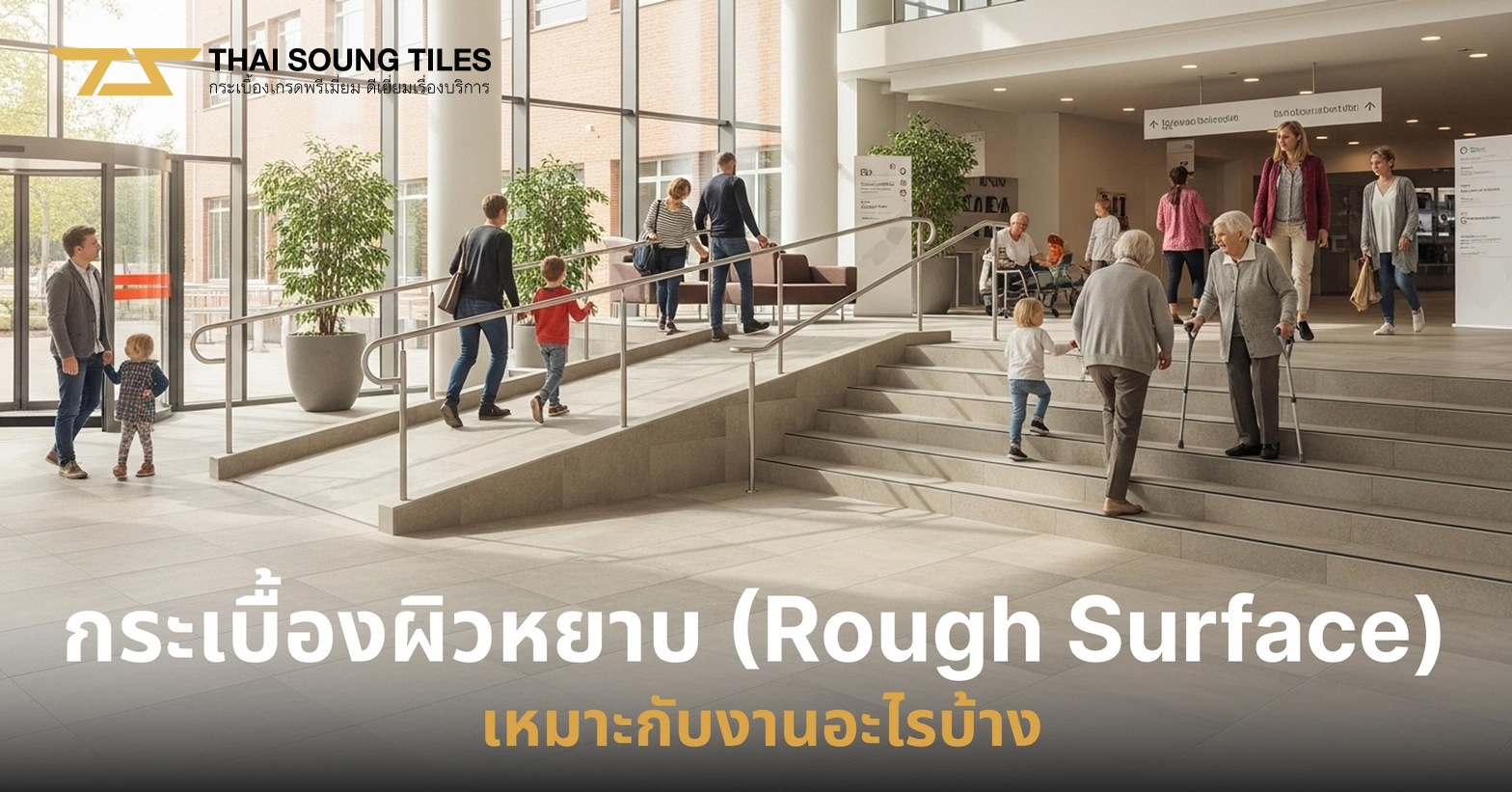 ในอาคารสาธารณะ โรงพยาบาล หรือแม้แต่บ้านที่มีผู้สูงอายุและเด็กเล็ก พื้นที่ที่มีการสัญจรสูงอย่างโถงทางเข้า หรือบริเวณที่มีความต่างระดับ เช่น ทางลาดและบันได ควรใช้กระเบื้องผิวหยาบเพื่อเพิ่มความปลอดภัยให้แก่ผู้ใช้งาน การยึดเกาะที่ดีเยี่ยมจะช่วยลดความเสี่ยงจากการสะดุดหรือลื่นล้มได้อย่างมาก