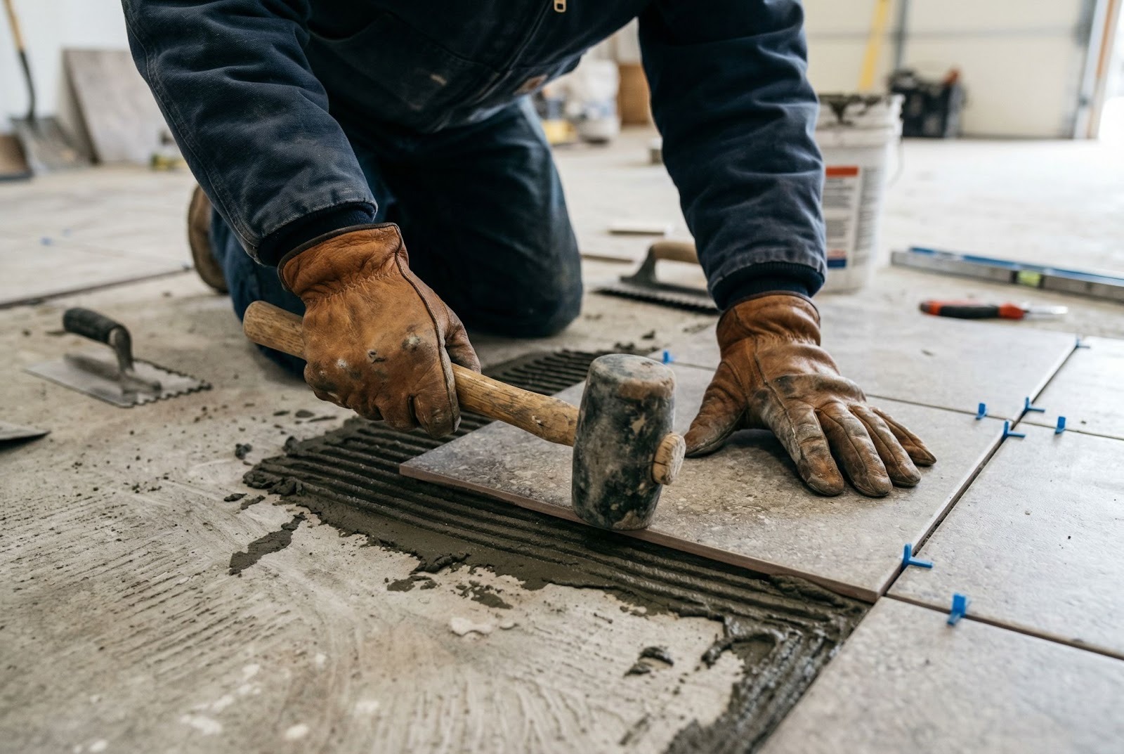 ในกรณีที่พื้นเดิมไม่เรียบ ควรปรับระดับด้วยปูนปรับพื้น (Self-leveling) หรือขัดแต่งให้เรียบก่อนเริ่มงาน เพื่อให้กระเบื้องแนบสนิททุกจุด ลดโอกาสเกิดโพรงอากาศใต้แผ่นในระยะยาว